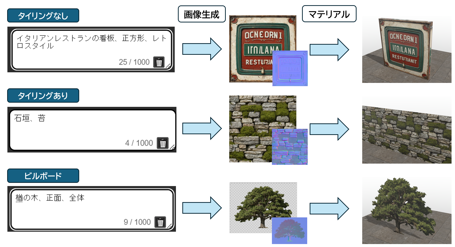 「テキストから生成」機能はテキストプロンプトによる指示に加えて、描画スタイルを指定して画像を生成する機能です。描画スタイルを選択することで、看板などの一枚絵、タイル・レンガなどのシームレスパターン、人・植栽などのビルボードに使いやすい透過画像といった用途に応じたテクスチャに特化した画像の生成ができます。また、絵画風、イラスト風といった通常の画像生成にも対応しており、室内パースに飾る絵画など、ちょっとした素材の生成にも利用可能です。