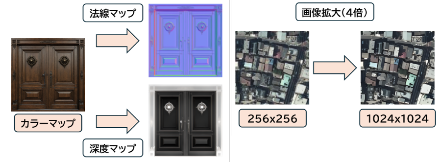 「画像から生成」機能は既存の画像をベースとして新たな画像を生成する機能です。「法線マップに変換」や「深度マップに変換」はカラーのテクスチャ画像からの法線、バンプマップへの変換が可能で、写真などしかない画像素材でも凹凸を持ったマテリアルを簡単に作成できるようになります。「画像拡大」は従来の画像拡大と異なり、AIによるノイズ除去、補間処理を行うことで、ボケのない高精細、高解像度な画像を生成することができます。これらの機能により、手持ちの限られた画像素材についても最大限の有効活用をすることが可能です。