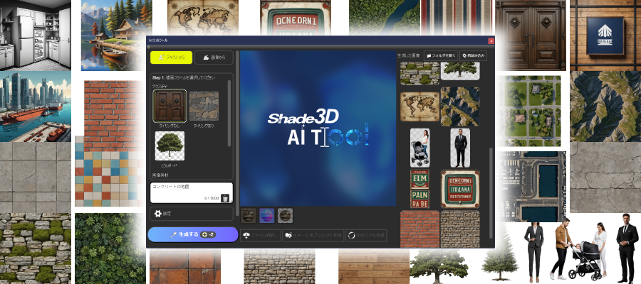 Shade3Dにインターフェースが統合されており、生成された画像をシーンに取り込むだけでなく、適切な設定がされたマテリアルを作成してモデルに適用することが可能です。法線マップの生成も同時に行うため、表面の微細な凹凸の表現にも対応しています。AI生成ツールを活用することで、画像素材の入手や手間のかかる編集、変換作業を行うことなく、マテリアル設定作業を手早く行うことができるようになります。