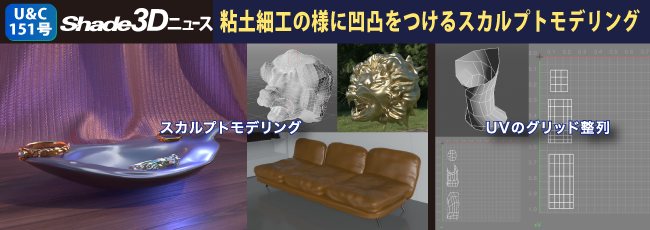 U&C 151号 Shade3Dニュースでは、Shade3D Ver.26の新機能として搭載されたポリゴンメッシュを粘土細工の様に、直感的にモデリングを行うことができるスカルプトモデリングが紹介されています。