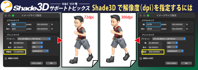 U&C 151号 サポートトピックス:Shade3Dでは、解像度(dpi)を 指定する方法が紹介されています。